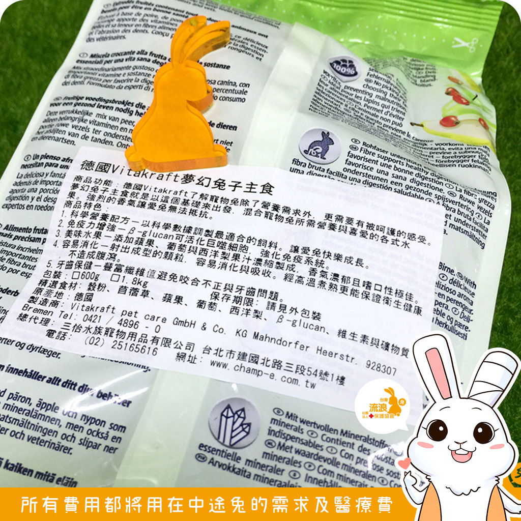 德國Vitakraft夢幻兔子主食600g1.8kg德國Vitakraft了解寵物兔除了營養需求外,更需要有被呵護的感受。夢幻兔子主食就是以這個基礎來出發,混合寵物兔所需營養與喜愛的各式水果。強烈的香氣讓愛兔無法抵抗。商品特色:精選食材﹕榖粉、苜蓿草、蘋果、葡萄、西洋梨、β-glucan、維生素與礦物質